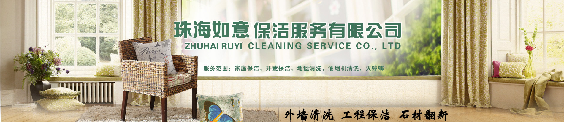 珠海市如意清潔主營(yíng):外墻清洗、地毯清洗、石材護(hù)理翻新、企業(yè)保潔、開(kāi)荒清潔、屋面防水、油煙管道清洗。家庭保潔,物業(yè)保潔,小區(qū)物業(yè)保潔,樓盤開(kāi)荒,沙發(fā)清潔,地板打蠟,(建筑、汽車玻璃貼膜)。